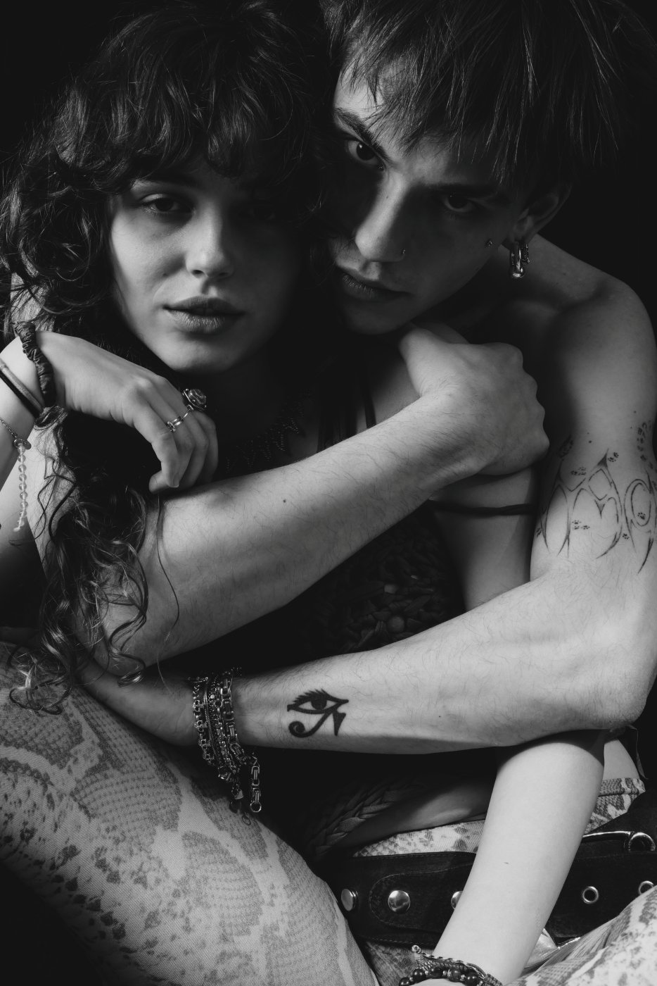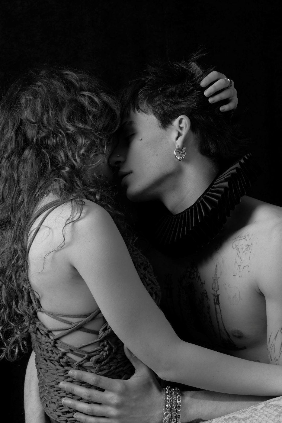 Dans l’espace suspendu du Studio Animica, la photographie cesse d’être une simple image et devient peau, souffle, essence. Pour leur portrait multisensoriel, Luca et Veronica ont choisi d’investir l’obscurité magnétique de Nocturnal de Pauline Rochas, transformant le décor en un théâtre de séduction introspective.