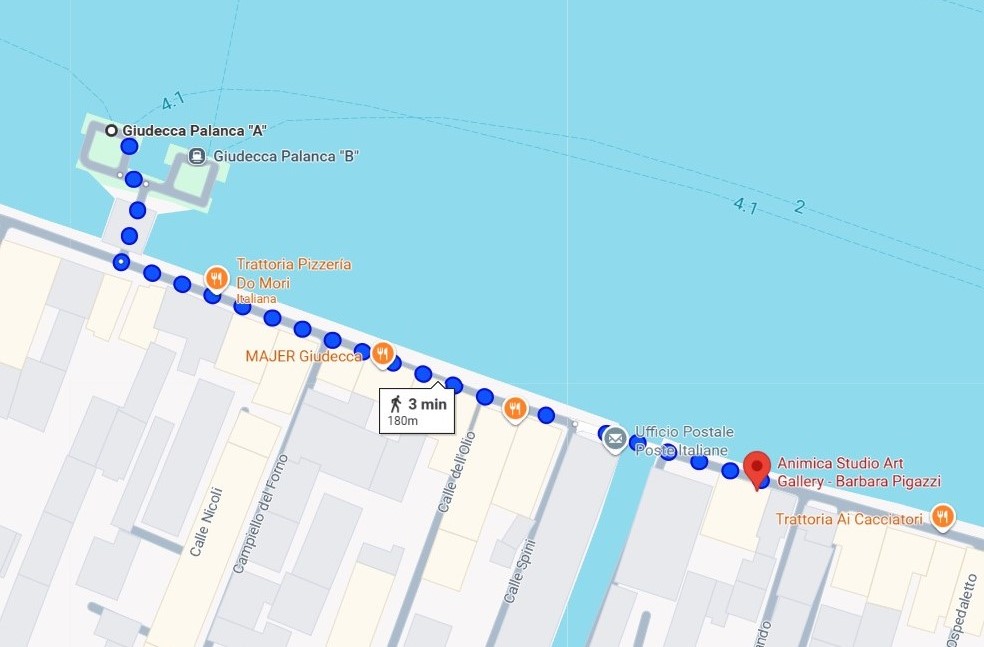 Get off at the Giudecca Palanca “A” stop, turn left and continue for about 180 meters, cross the Ponte Piccolo, and as soon as you get off the bridge on the right you will see the Animica Art Gallery studio.